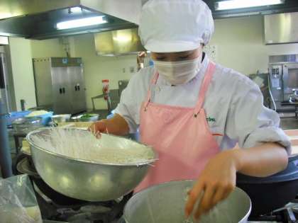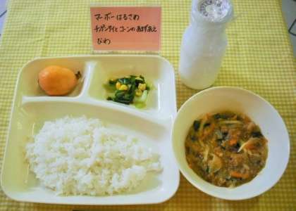 今日の献立は、「マーボーはるさめ、チンゲンサイとコーンの中華あえ、びわ、ごはん、牛乳」です。びわは1年に1回登場する季節の果物です。「甘くておいしかった。」「家で植えるから種を持って帰る。」と教えてくれた子もいました。 給食では、全部の材料を検品します。はるさめも異物がないかきちんと点検しています。点検後、ゆでて水にさらしてから、炒めた肉や野菜に加えてマーボーはるさめをつくりました。