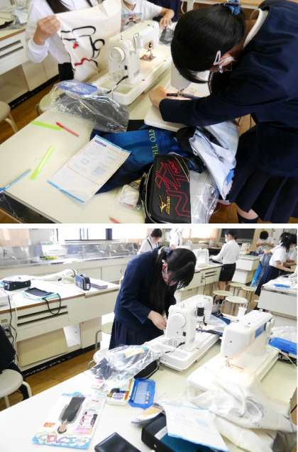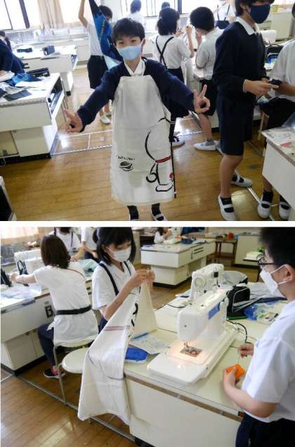 6年生がミシンで作っているエプロンが完成しました。エプロンをつけておうちでの手伝いができそうですね。