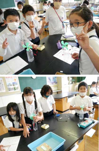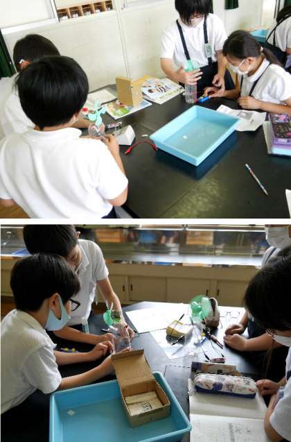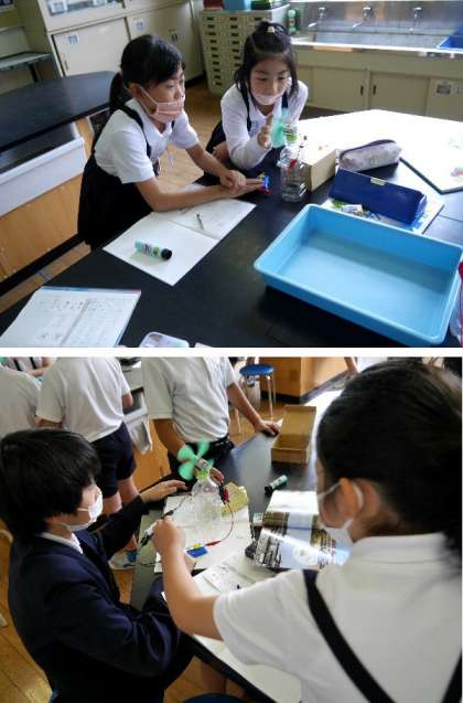 4年生が理科室で実験しています。乾電池とモーターをつないで、検流計をつないで、モータの回るむきなどを確認していました。