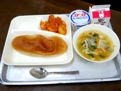 今日の献立は、えびのチリソース、中華スープ、ヨーグルト、黒糖パン、牛乳でした。