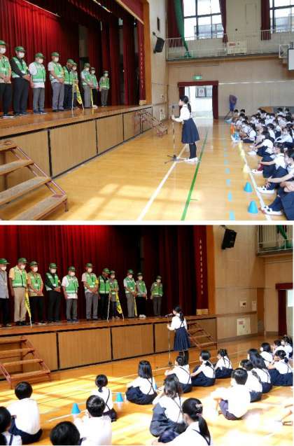 今日の児童集会では、いつもお世話になっている地域の見守り隊の方々にご来校いただきました。改めて、各町会から来ていただいている見守り隊の方々の自己紹介をいただき、代表児童から日頃の感謝を伝えさせていただきました。