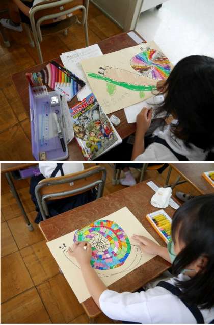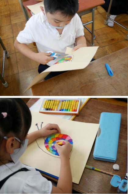 2年生がカラフルなカタツムリを描いています。できあがったら、切り取ってアジサイの花の絵にはりつけます。