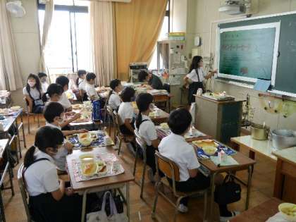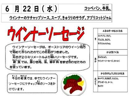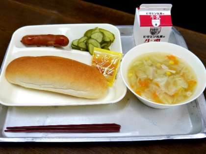 今日の献立は、ウインナーのケチャップソース、スープ、きゅうりのサラダ、アプリコットジャム、コッペパン、牛乳でした。
