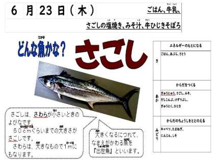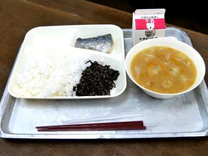 今日の献立は、さごしの塩焼き、みそ汁、牛ひじきそぼろ、ごはん、牛乳でした。