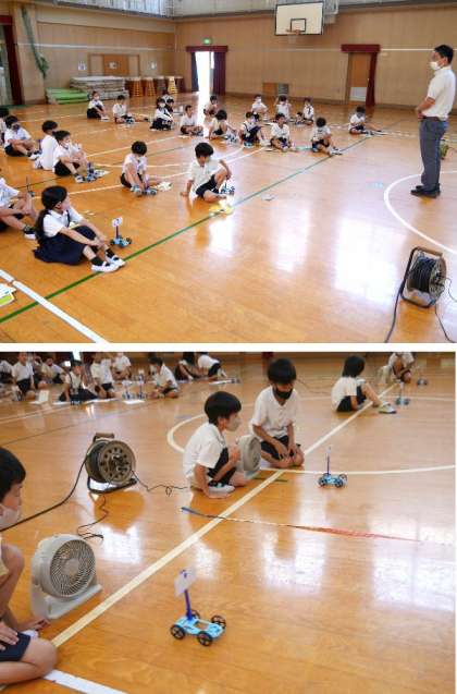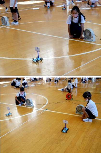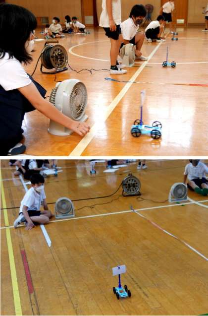 3年生では風力で動く車を作りました。風をうけて前に進みます。扇風機の強さをかえたり、帆の大きさを変えると、車の走る距離がどうかわるのか実験していました。