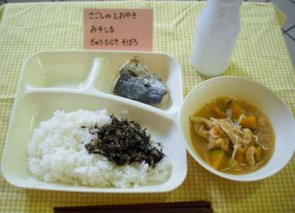 今日の献立は、「さごしの塩焼き、みそ汁、牛ひじきそぼろ、ごはん、牛乳」です。 牛ひじきそぼろは、牛挽肉とひじきを炒めて砂糖、みりん、しょうゆで味付けし最後にしそを加えて炒めています。ごはんによくあう献立で、しその風味がほどよくきいていてサッパリとした味に仕上がっていました。「おいしい」とよく食べていましたが、しそが「にがて」という人もいました。