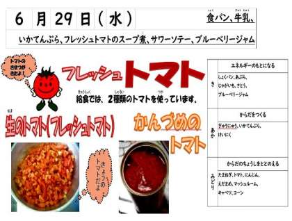 今日の献立は、いかてんぷら、フレッシュトマトのスープ煮、サワーソテー、ブルベリージャム、食パン、牛乳でした。