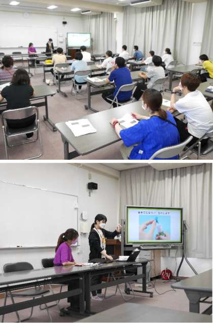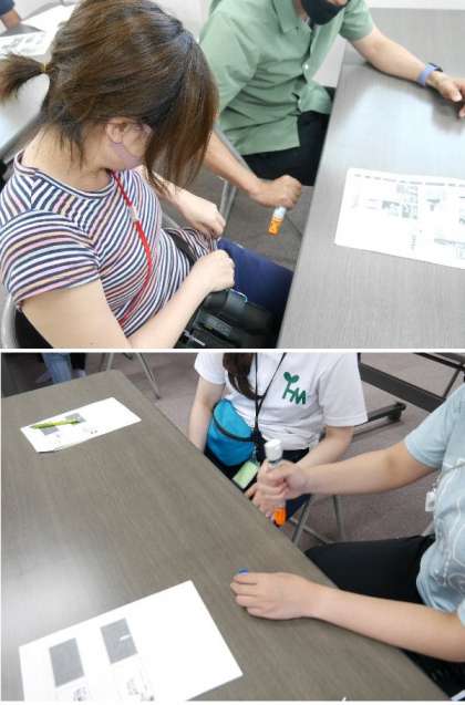 給食後などに、児童がアレルギーでアナフィラキシー症状が出たときのための研修を行いました。どんな症状が該当するかや、文科省のミニドラマなどで研修したあと、エピペンの使い方を実践練習を行いました。