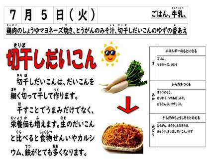 今日の献立は、鶏肉のしょうゆマヨネーズ焼き、とうがんのみそ汁、切り干し大根のゆずの香あえ、ごはん、牛乳でした。