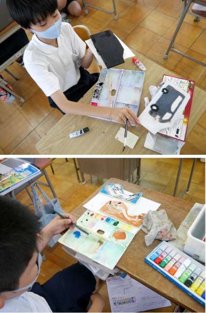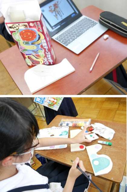 6年生が、木板を切りとって、テープカッターを作っています。いろいろなデザインを考えて、絵にあわせて切りました。
