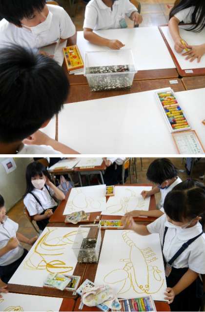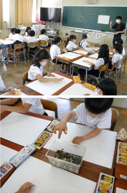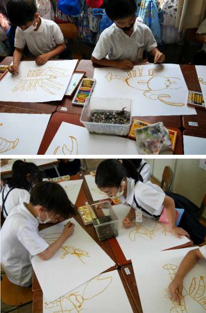 2年生のクラスでは、教室で飼っているザリガニを描いていました。じっくり観察してハサミや胴体などをていねいに描いていました。