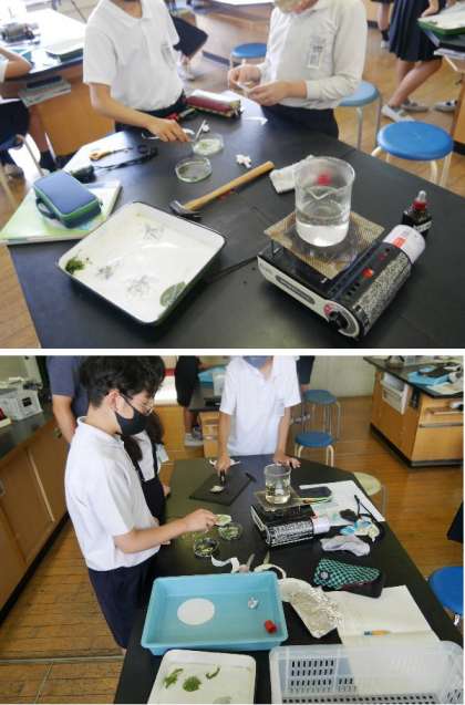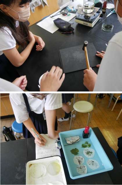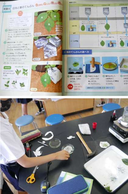 6年生が理科室で実験をしています。植物の葉をに日光があたると、ぜんぷんができるのかを調べています。アルミ箔で包んだ葉と日光がよく当たった葉を、ヨウ素液につけてしらべていました。