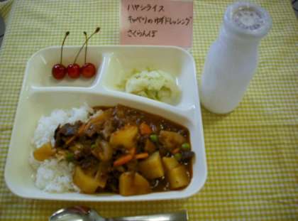 今日の献立は、「ハヤシライス、キャベツのゆずドレッシング、さくらんぼ、牛乳」です。甘酸っぱいさくらんぼは、1人3粒ずつです。今日は山形県産の佐藤錦でした。 ハヤシライスは、小麦粉とサラダ油を20分かけて炒めて作ったブラウンルウでじっくり煮込んでいます。小麦粉の香ばしい風味がハヤシライスをよりおいしくしました。