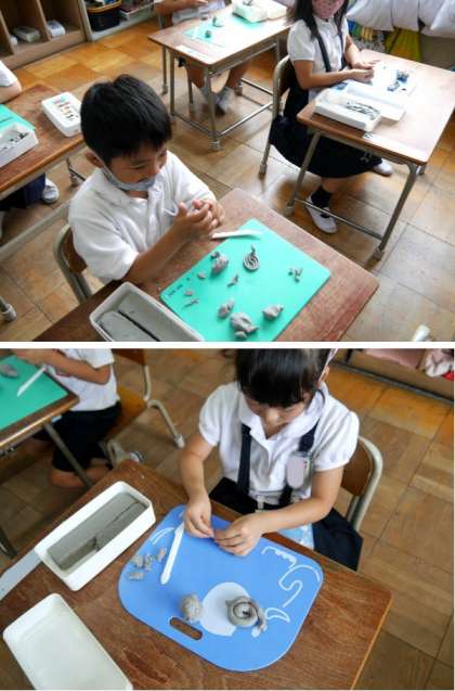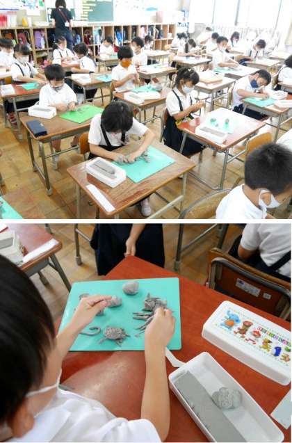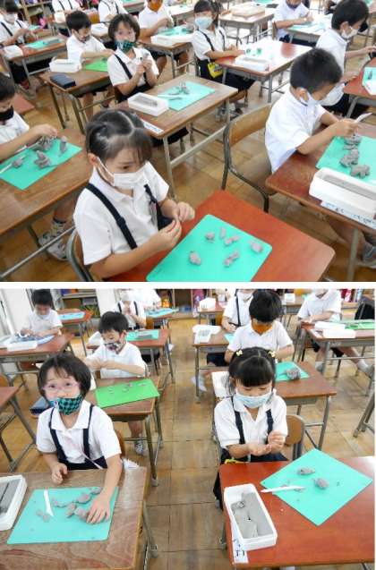 1年生がねんどで動物を作っています。たのしそうに、「こんなん作ったよ」と教えてくれます。