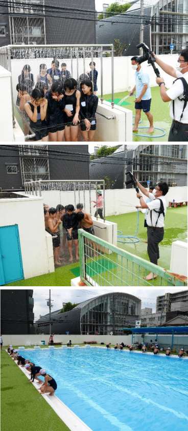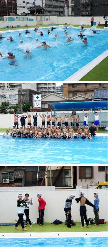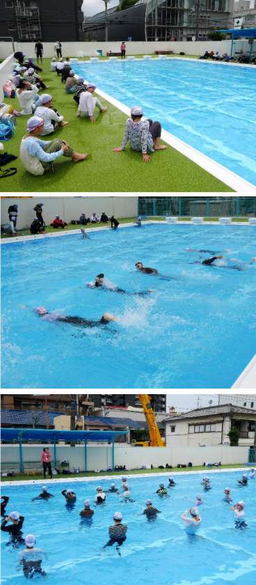 6年生のプールの授業です。今日はアルバム用の写真を撮影しました。また、着衣水泳の学習を行いました。災害時にそなえ、服を着ての水泳を体験しました。
