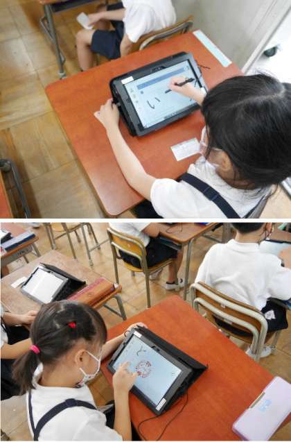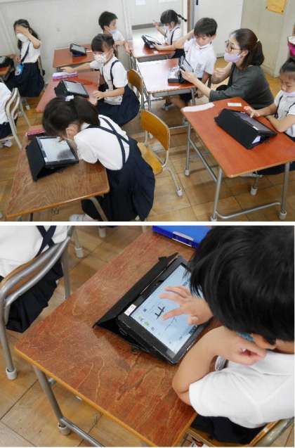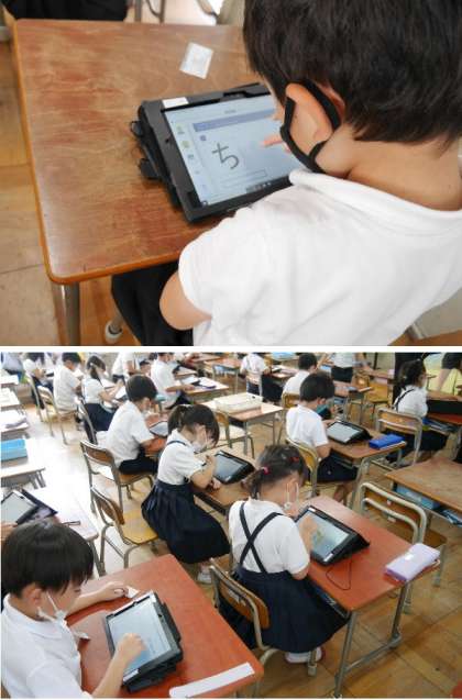 1年生がタブレットを使えるようになってきました。デジタルドリルで学習を振り返って学習しています。
