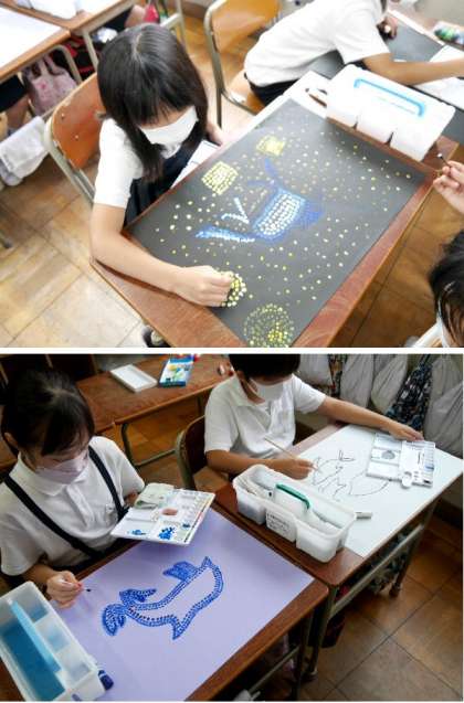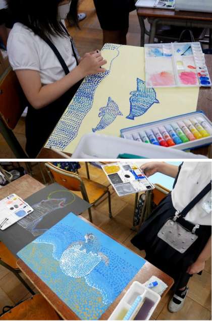 4年生が、絵具で点描しながら絵を描いています。細かい作業ですね。