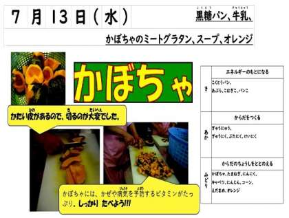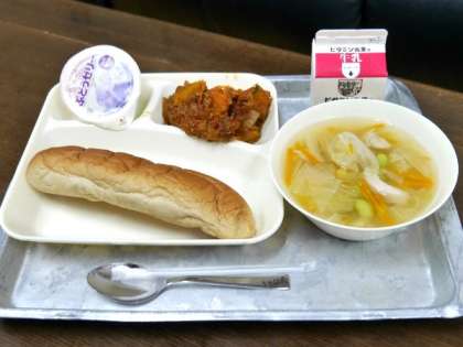 今日の献立は、かぼちゃのミートグラタン、スープ、ぶどうゼリー、黒糖パン、牛乳でした。オレンジはゼリーに変更になりました。
