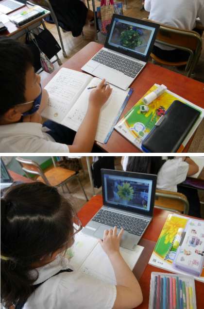 3年生が、パソコンのカメラ機能を使って、マリーゴールドの花やミニヒマワリの花の観察をしていました。パソコンで大きくひき伸ばしてみることができるので、よくわかりますね。