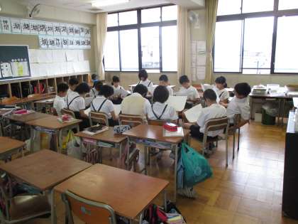 (写真中)できた作文を、お互いに回して読んでいます。