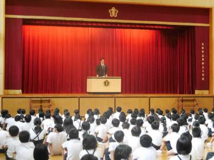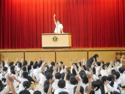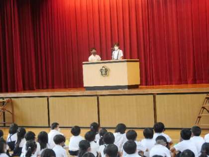 5時限目に、講堂に集まって、1学期末の終業式をおこないました。5年生の代表児童が1学期を振り返ってくれました。できたこと、よかったことなどたくさんありました。2学期にむけて頑張りたいこともありますね。