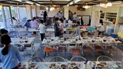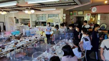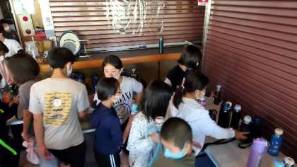 みんなが食堂に集まってきました。水筒にお茶を補充します。
