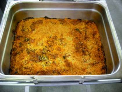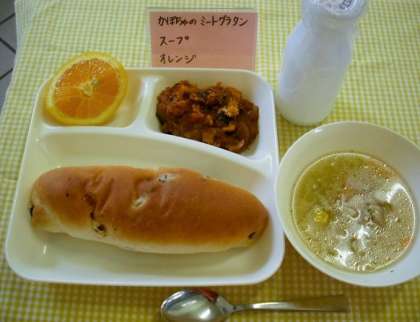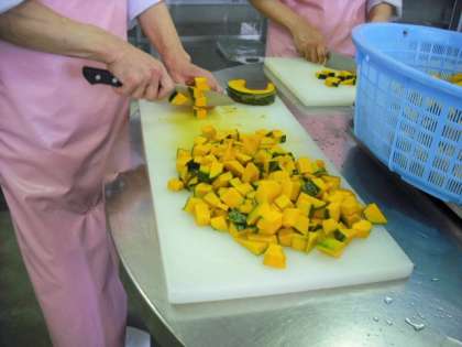 今日の献立は、「かぼちゃのミートグラタン、スープ、オレンジ、レーズンパン、牛乳」です。6月から10月までの間、かぼちゃを使った献立がたくさん登場します。今日は、挽肉やたまねぎとともにグラタンにしました。甘みがあってビタミンたっぷりのかぼちゃですが、丸ごとのかぼちゃを子どもたちが食べやすい大きさに切っていくのはとても大変でした。