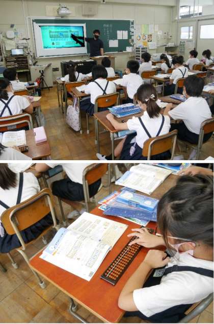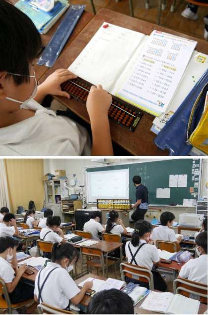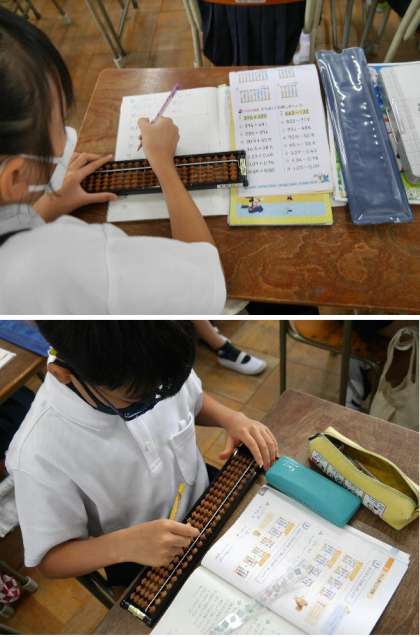 4年生の算数では、そろばんを使って計算をする体験をしました。