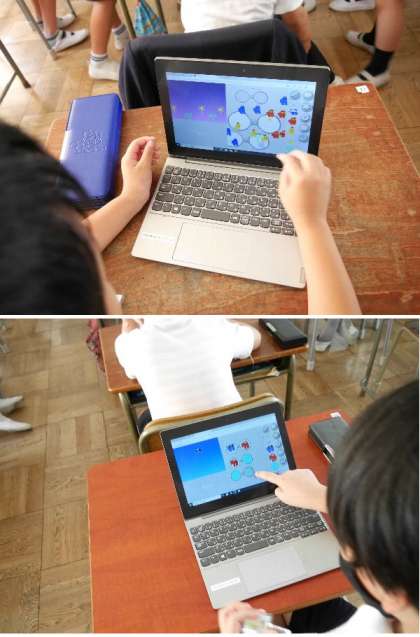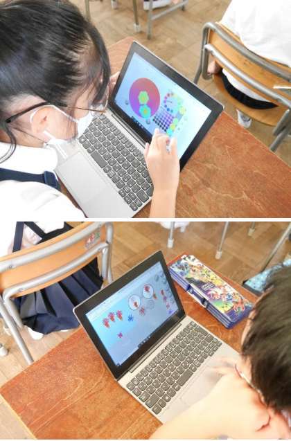 3年生では、パソコンでプログラミングをしています。「ビスケット」というアプリで、花火がうちあがるプログラムをつくりました。