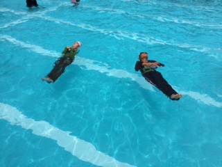 全国で痛ましい水の事故が、残念ながら毎年おこっています。そこで本校では服を着たまま水に入り、どれだけ泳ぎにくいかを全学年の子どもたちが体験しています。ペットボトルひとつで十分に身体が浮くことも体験しました。もしもの時に、この経験が子どもたちの命を救うことになればと思い、溺れた時の注意も含めて指導に熱が入ります。