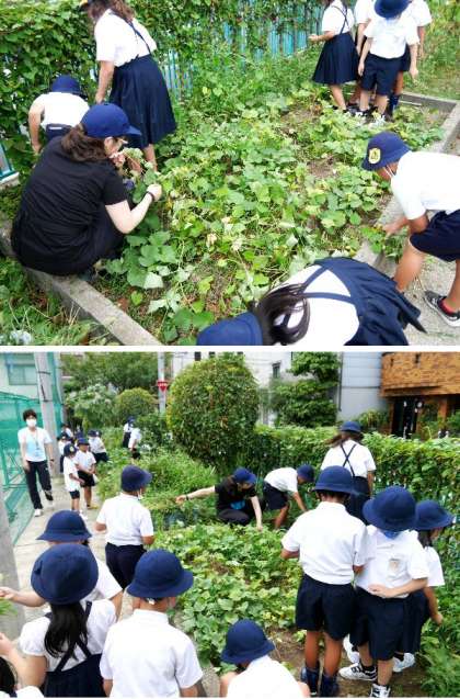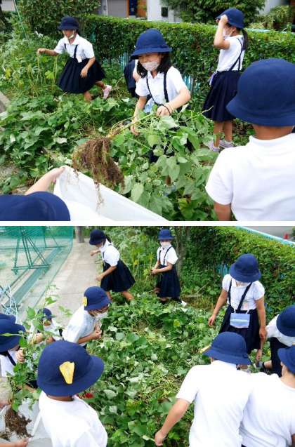 3年生が育てているサツマイモ畑の雑草を抜いています。秋に収穫できるように育てています。
