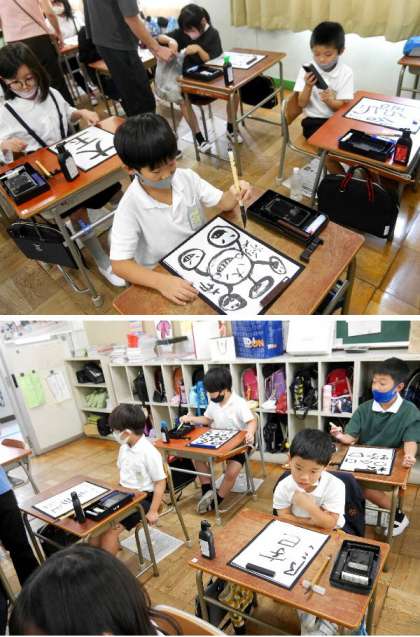3年生が習字の練習をしています。まずは筆になれるようにいろいろな線をひいてみます。