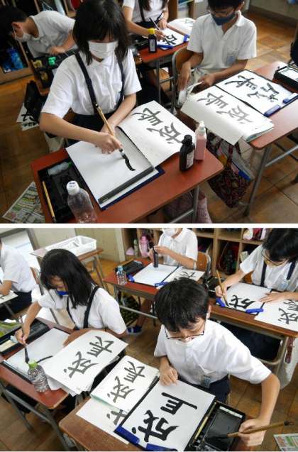 5年生が書道で「成長」と書いて練習しています。林間学習でまたひとまわり成長できましたね。