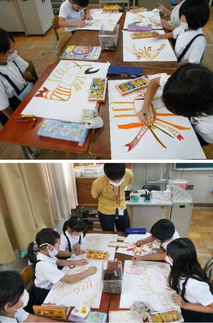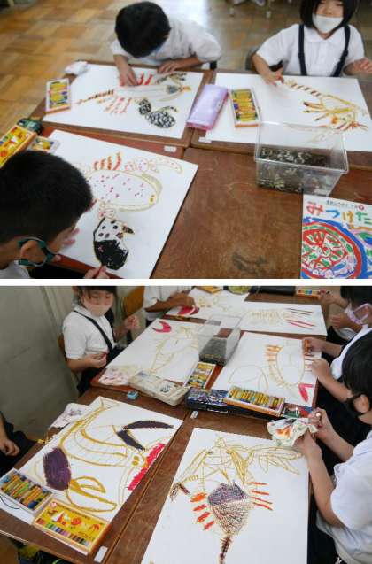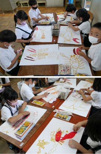 2年生の図工では、教室で育てているザリガニの絵を描いています。ハサミの赤いつぶつぶも丁寧に描きこんでいきます。迫力ある絵ができそうです。