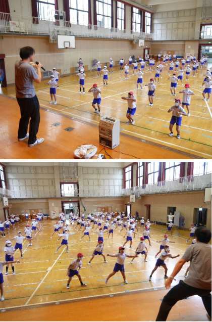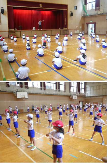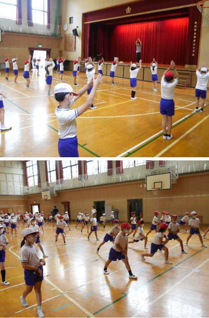 3年生の団体演技の練習が始まりました。2曲の音楽にあわせてダンスします。先生の動きをみながら、あわせていきます。