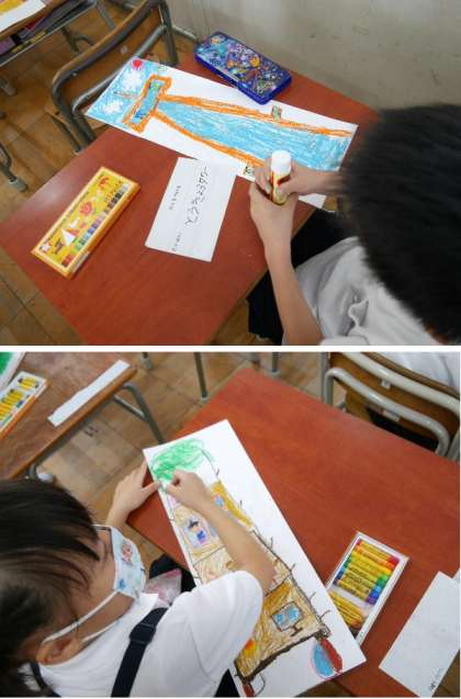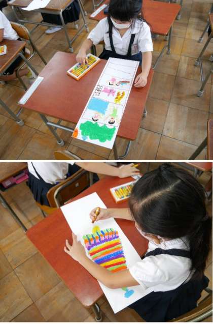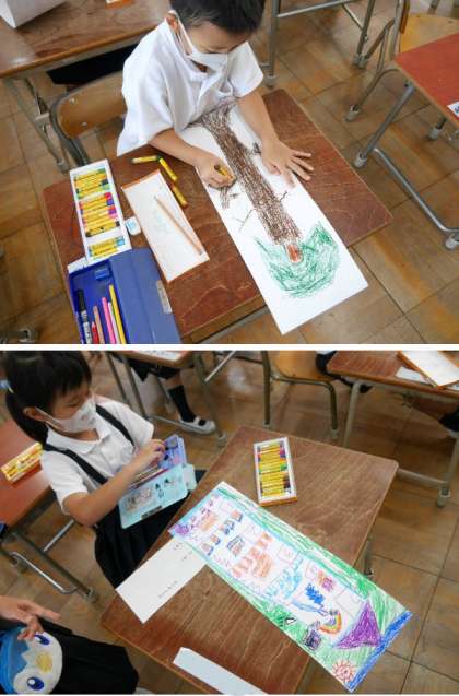 1年生では、長い画用紙に絵を描いています。長い紙にあわせた、パフェや東京タワーなど、いろいろな長いものを描いています。