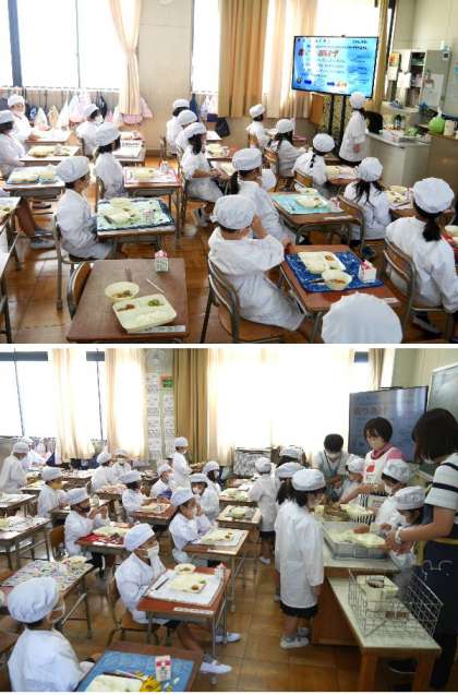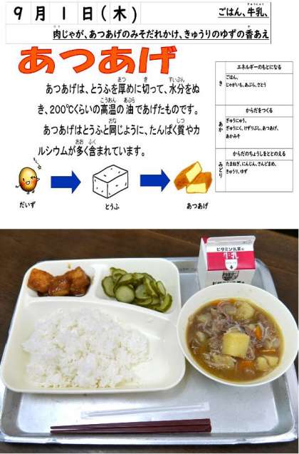 今日の献立は、肉じゃが、あつあげのみそだれかけ、きゅうりのゆずの香あえ、ごはん、牛乳でした。毎日、給食カレンダーはプロジェクタで画面に表示されています。係の児童が読んで皆に紹介しています。
