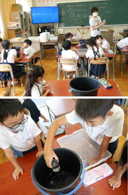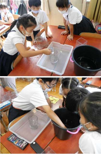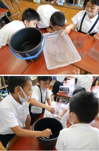 2年生では、1dlや1Lの量について学習しています。実際に、水をますでくんでみて体感して学習しています。