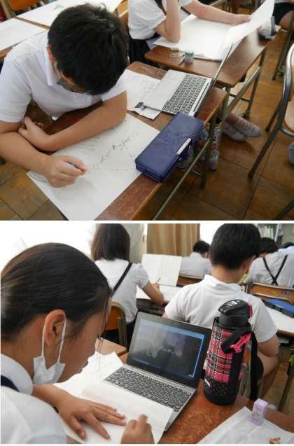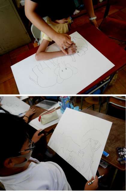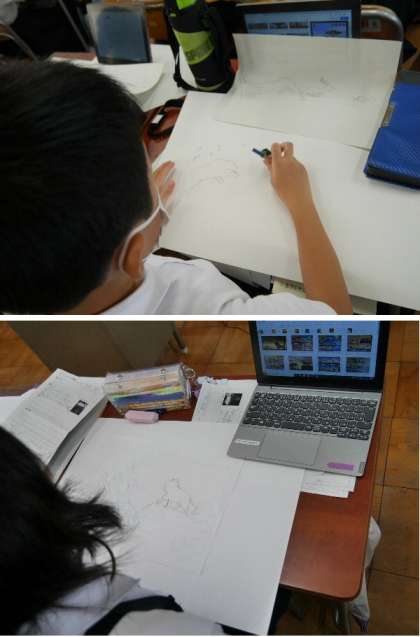 5年生が、サバンナを想像して動物たちのいる絵を描いています。
