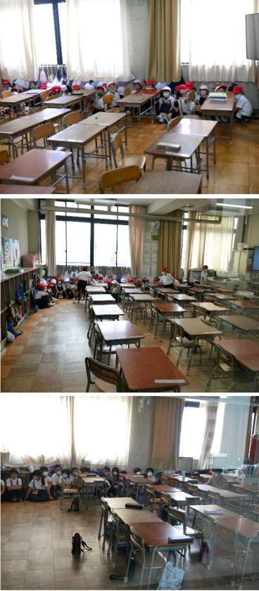 先週は雨天だったので、延期された避難訓練を行いました。今回は不審者への対応です。不審者が校内に侵入したことを想定して、各教室では戸締りして身を潜めています。先生がたは不審者への対応をします。安全が確認されたあと、運動場に集合しました。