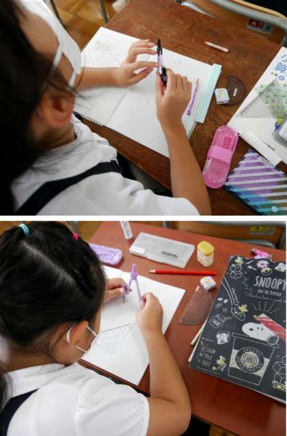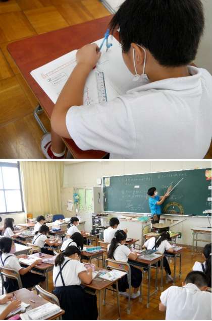3年生の算数は、習熟度別少人数授業です。三角定規やコンパスを使って平行四辺形をかく練習をしていました。