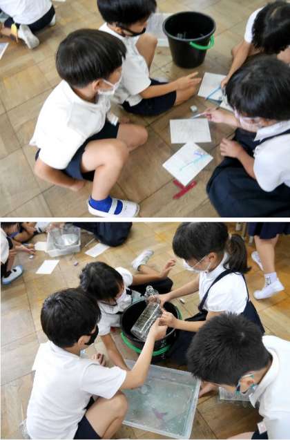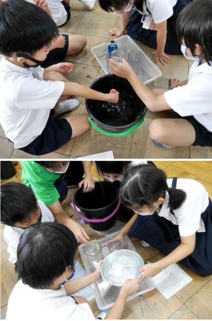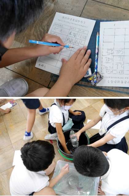 2年生の算数では水のかさをはかる学習をしています。いろいろな容器の水かさを調べています。