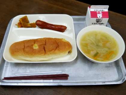 今日の献立は、ウインナーのケチャップソース、スープ、焼きかぼちゃ、おさつパン、牛乳でした。