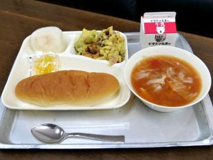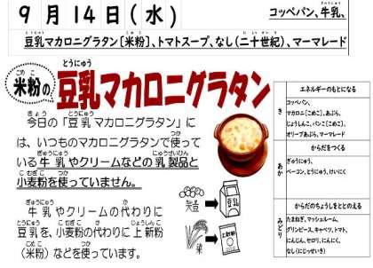 今日の献立は、豆乳マカロニグラタン(米粉)、トマトスープ、二十世紀梨、マーマレード、コッペパン、牛乳でした。