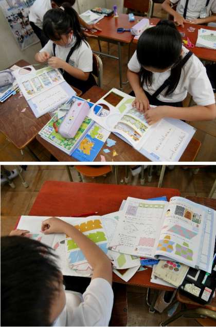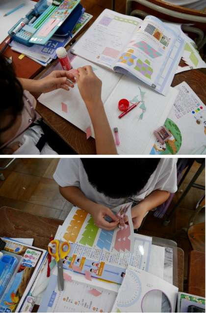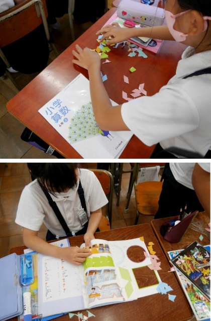4年算数では、教科書の末巻についている四角形を切り抜いて、ノートにしきつめて貼っていきます。台形や四角形をしきつめてわかったことを考えます。