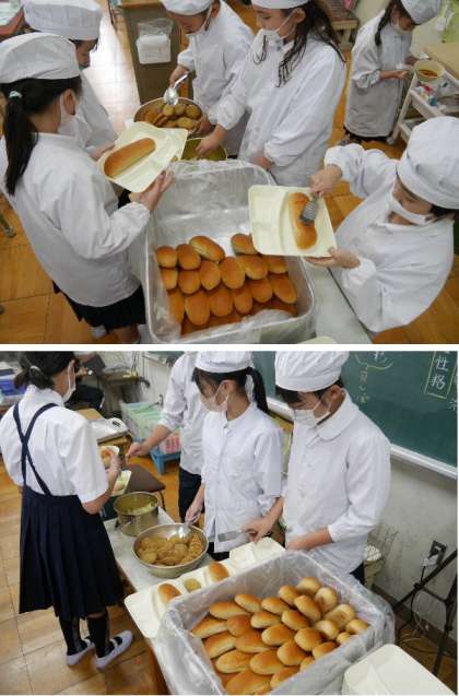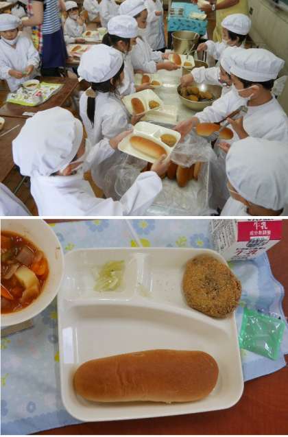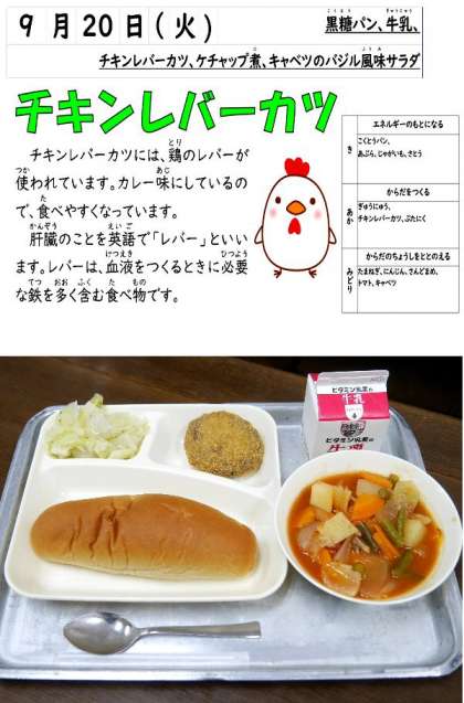 今日の献立は、チキンレバーカツ、ケチャップ煮、キャベツのバジル風味サラダ、黒糖パン、牛乳でした。