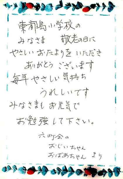 東都島地域のお年寄りの方々に、子どもたちがメッセージカードを作ってお渡ししました。子どもたちのメッセージに、町会からお礼のお手紙をいただきした。