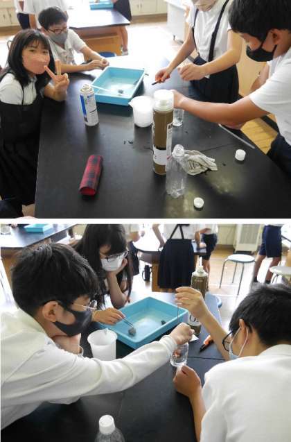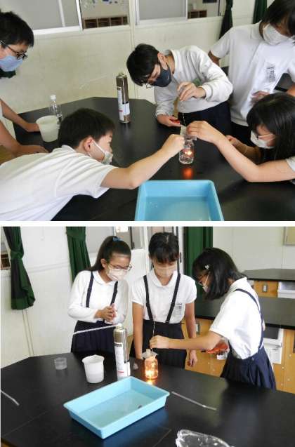 6年生が理科室で実験をしています。鉄のウールに火をつけて燃やしています。酸素を入れると激しく燃え上がります。