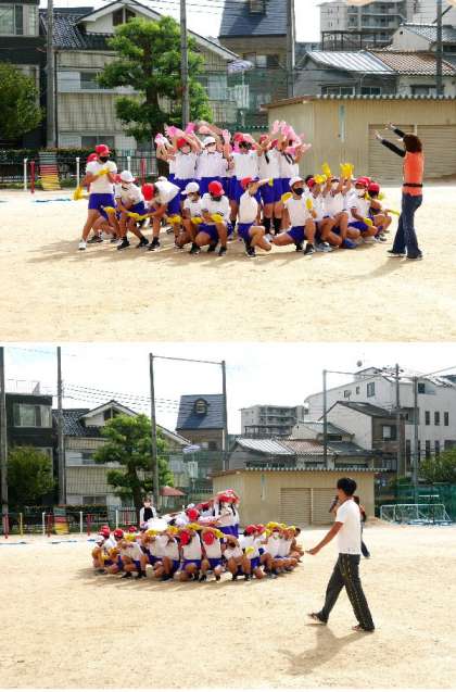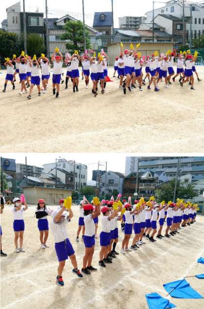 6年生の団体演技は3年ぶりです。旗を使った演技のあとに、最後のしめくくりに取り組んでいました。