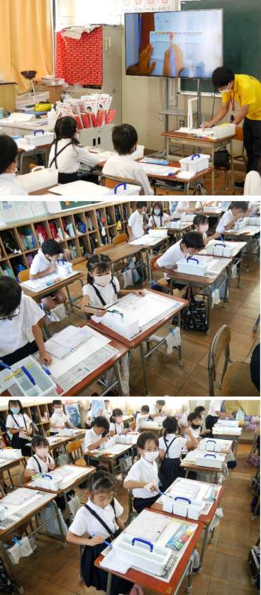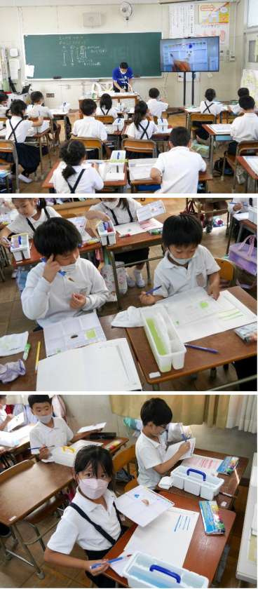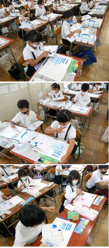 2年生では、はじめての絵の具を使ってみました。水の調整がむずかしいかな。どれくらいの水でどんな色になるかも確認していました。今までクレヨンを使っていたのとは少し違いますが、表現の幅がひろがっていきますね。